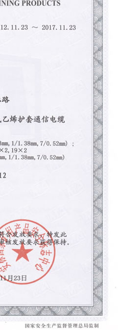 矿用产品安全标志证书(MHY32煤矿用聚乙烯绝缘钢丝铠装聚氯乙烯护套通信电缆)